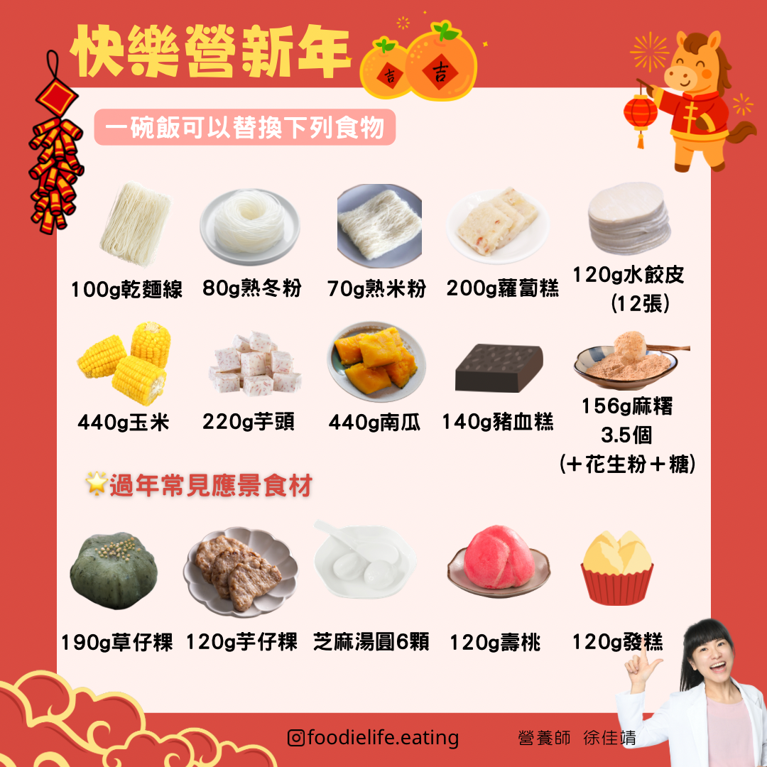 在年菜餐桌上,我們常忽略許多「隱形澱粉」。請參考下圖的代換公式,以下份量皆約等於 一碗飯 (60g 醣類 / 280大卡) 的熱量與含醣量: